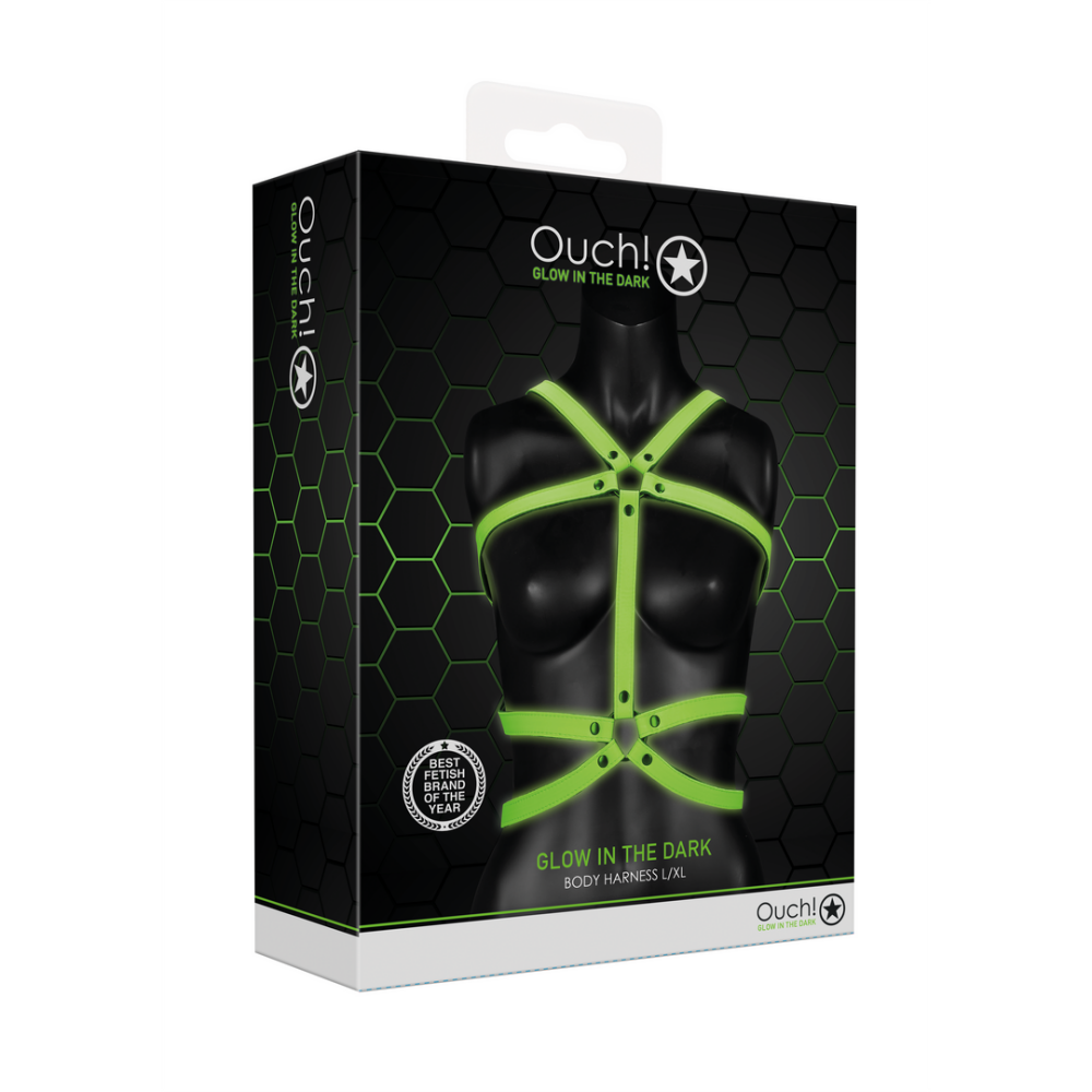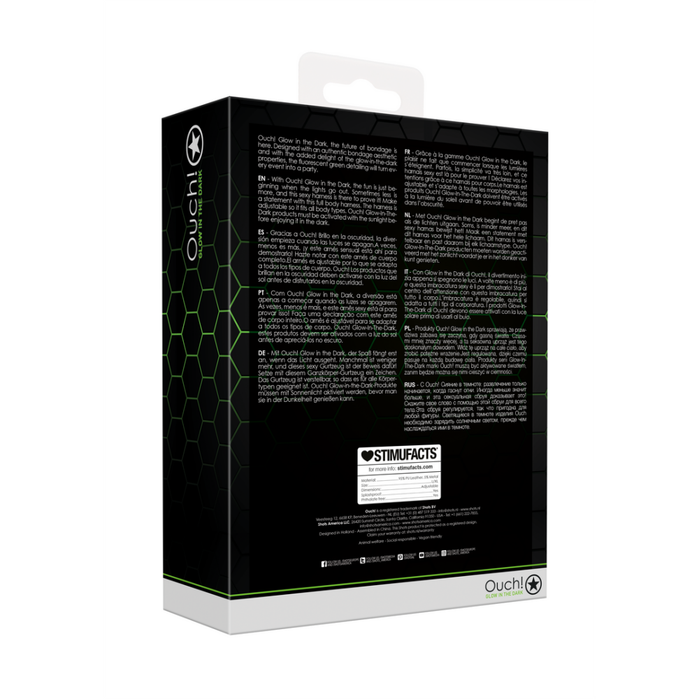 Ouch! Glow in the Dark, de toekomst van bondage is hier. Het design heeft het autentiek bondage uiterlijk, maar brengt licht in het duister door zijn fluoresecrende groene details waardoor alles een feest wordt. Soms, is minder meer, en dit sexy harnas bewijst het! Maak een statement met dit harnas voor het hele lichaam. Dit harnas is verstelbaar en past daarom bij elk lichaamstype. Ouch! Glow-In-The-Dark producten moeten worden geactiveerd met het zonlicht voordat je er in het donker van kunt genieten.