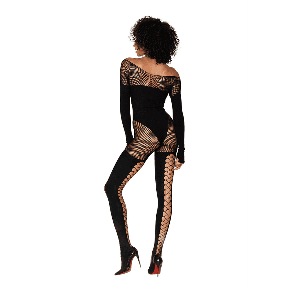 Naadloze ondoorzichtige en visnet bodystocking met gebreid ondoorzichtig teddy ontwerp en nep veterschoen ontwerp.