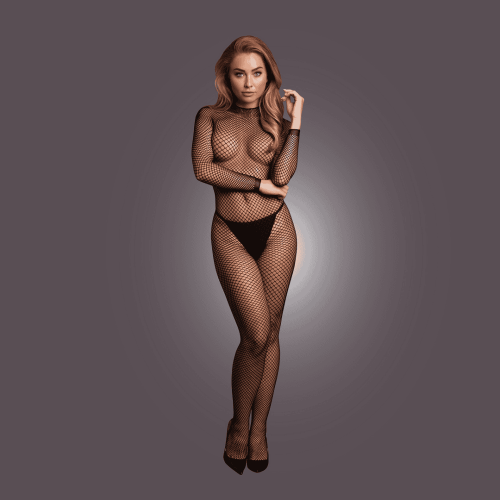 Visnet bodystocking met lange mouwen, col en open kruis. De open rug zorgt voor een extra vleugje sexiness. De zachte super stretchy stof past in de maten XS tot XL.