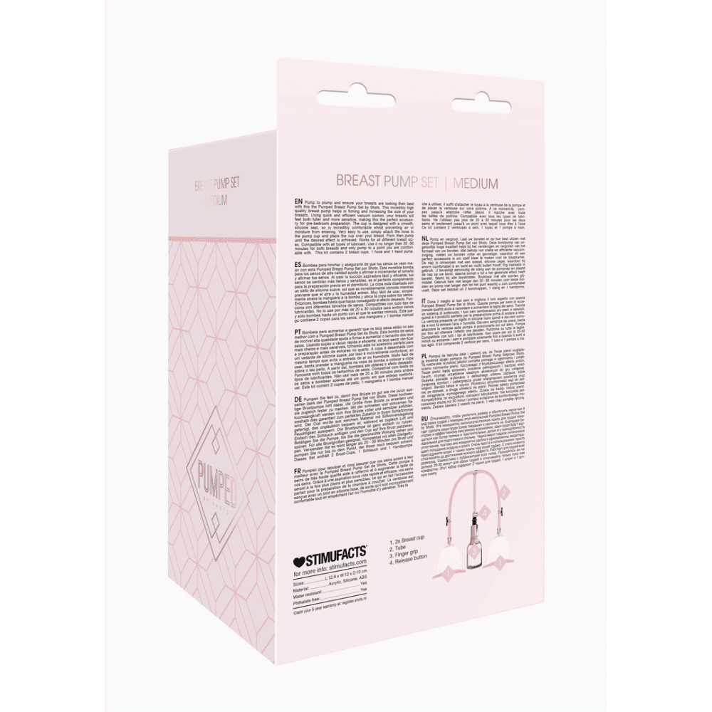 Pomp en vergroot. Laat uw borsten er op hun best uitzien met deze Pumped Breast Pump Set van Shots. Deze borstpomp van on- gelooflijk hoge kwaliteit helpt bij het verstevigen en vergroten van het formaat van uw borsten. Met behulp van snelle en efficiënte vacuüm- zuiging, voelen uw borsten voller en gevoeliger, waardoor dit een perfect accessoire is om uzelf klaar te maken voor de slaapkamer. De nap is ontworpen met een soepel, silicone zegel, waardoor hij enorm comfortabel is en lucht en vocht buiten houdt. Erg makkelijk in gebruik. U bevestigt eenvoudig de slang aan de pompnap en plaatst de nap op uw borst. daarna pompt u tot u het gewenste effect heeft bereikt. Werkt bij alle borstmaten. Bruikbaar met alle soorten glij- middel. Gebruik hem niet langer dan 20 -30 minuten voor beide bor- sten en pomp niet langer dan tot het punt waarbij u zich comfortabel voelt. Deze set bestaat uit 2 borstnappen, 1 slang en 1 handpomp.WAARSCHUWING: Lees de producthandleiding alvorens een vacuümpomp te gebruiken. Stop onmiddellijk met het gebruik van het apparaat als u pijn of ongemak ervaart.