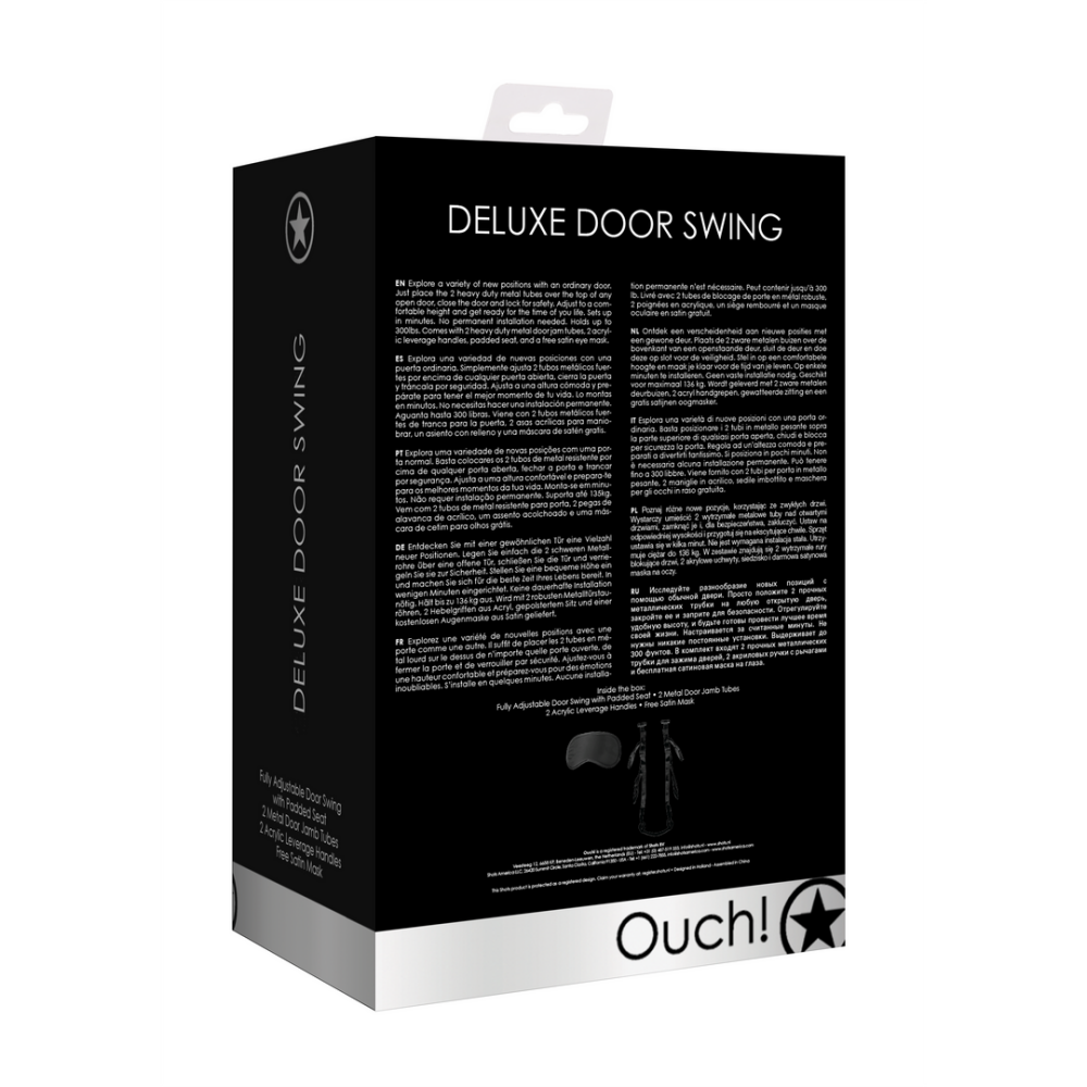 Ontdek een verscheidenheid aan nieuwe posities met een gewone deur. Plaats de 2 zware metalen buizen over de bovenkant van een openstaande deur, sluit de deur en doe deze op slot voor de veiligheid. Stel in op een comfortabele hoogte en maak je klaar voor de tijd van je leven. Op enkele minuten te installeren. Geen vaste installatie nodig. Geschikt voor maximaal 400kg/881lbs. Wordt geleverd met 2 zware metalen deurbuizen, 2 acryl handgrepen, gewatteerde zitting en een gratis satijnen oogmasker.