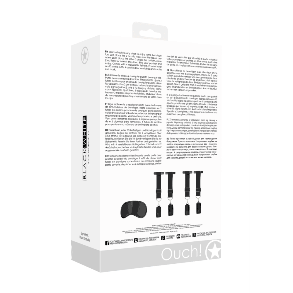 Gemakkelijk te bevestigen aan elke deur om te genieten van wat bondageplezier. Plaats de 2 acryl buizen over de bovenkant van een openstaande deur, plaats de andere 2 onder de onderkant, sluit (op slot voor de veiligheid) de deur. Bind jouw partner vast en geniet. Wordt geleverd met 4 verstelbare bevestigingen, 2 handboeien en 2 enkelboeien, 4 acryl deurbuizen en een satijnen oogmasker.