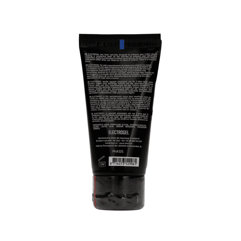 ELECTROGEL is speciaal ontworpen om uw E-Stim-spel te verbeteren. Voor het beste resultaat brengt u een dun laagje aan op het speeltje of uw huid. Na gebruik met warm water schoonmaken. Deze gel fungeert als een geleidend hulpmiddel dat de voordelen en sensaties van uw favoriete elektroseksproducten versterkt, door het creëren van een laagje op de huid. De perfecte partner om te gebruiken in combinatie met SHOTS E-stimulatieapparaten en andere electro play-apparaten. Slechts een kleine hoeveelheid gel verbetert de intensiteit van de erotische elektrostimulatie aanzienlijk. De aanwezigheid van melkzuur en extra zouten in de gel verbeteren de geleidbaarheid van elektriciteit. Het product is na gebruik gemakkelijk te verwijderen met lauw water. Maakt geen vlekken.Buiten bereik van kinderen houden. Bewaren op een koele, donkere plaats.