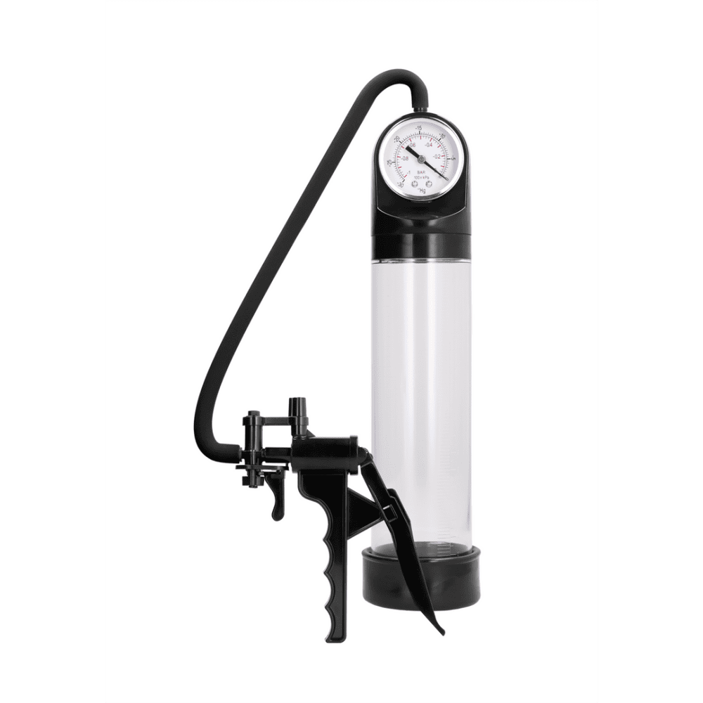 This model is equipped with a built-in pressure gauge for better control. The plastic pistol handle allows precise adjustment, while the clear cylinder and quick release valve ensure safe and easy operation. The cylinder measures 20 cm in length and 6 cm in diameter. WARNING: Please read product manual before using any type of vacuum pump orconstriction ring. Stop using the devices immediately if you experience any pain or discomfort.