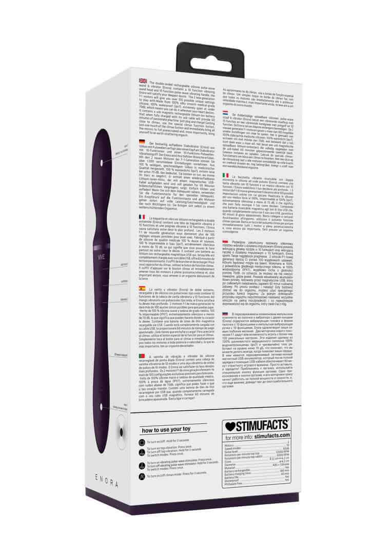 De ENORA is een tweezijdige pulsgolf staafvibrator en is uitgevoerd met een vibrerende staafkop met 10 functies en een vibrerende pulsgolf handgreep met óók 10 verschillende functies. De ENORA is multifunctioneel en zal ongetwijfeld al je diepste verlangens bevredigen! De 2 motoren geven je meer dan 100 unieke instellingen om mee te spelen. Deze staafvibrator is gemaakt van 100% zijdezachte medische siliconen,100% waterdicht (ipx7) en is extreem stil bij minder dan 70db, wat betekent dat je hem (bijna) overal kunt gebruiken waar je hartje begeert. Hij bevat een li-ionbatterij die, wanneer volledig opgeladen, 60 minuten hartstochtelijke speeltijd zal bieden.Klik de bijgesloten USB kabel op het magnetische aansluitpunt en hij laadt op! Wanneer een climax nadert, zal één druk op de speciale functie climax-knop onmiddellijk alle motoren op volle kracht / snelheid brengen en, nog belangrijker, je naar een wereldschokkend orgasme voeren.