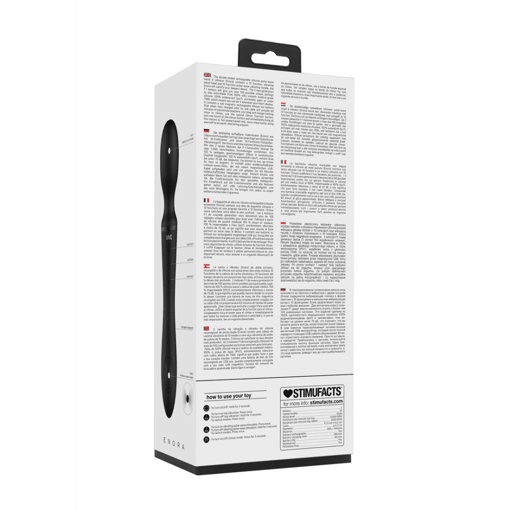 De ENORA is een tweezijdige pulsgolf staafvibrator en is uitgevoerd met een vibrerende staafkop met 10 functies en een vibrerende pulsgolf handgreep met óók 10 verschillende functies. De ENORA is multifunctioneel en zal ongetwijfeld al je diepste verlangens bevredigen! De 2 motoren geven je meer dan 100 unieke instellingen om mee te spelen. Deze staafvibrator is gemaakt van 100% zijdezachte medische siliconen,100% waterdicht (ipx7) en is extreem stil bij minder dan 70db, wat betekent dat je hem (bijna) overal kunt gebruiken waar je hartje begeert. Hij bevat een li-ionbatterij die, wanneer volledig opgeladen, 60 minuten hartstochtelijke speeltijd zal bieden.Klik de bijgesloten USB kabel op het magnetische aansluitpunt en hij laadt op! Wanneer een climax nadert, zal één druk op de speciale functie climax-knop onmiddellijk alle motoren op volle kracht / snelheid brengen en, nog belangrijker, je naar een wereldschokkend orgasme voeren.