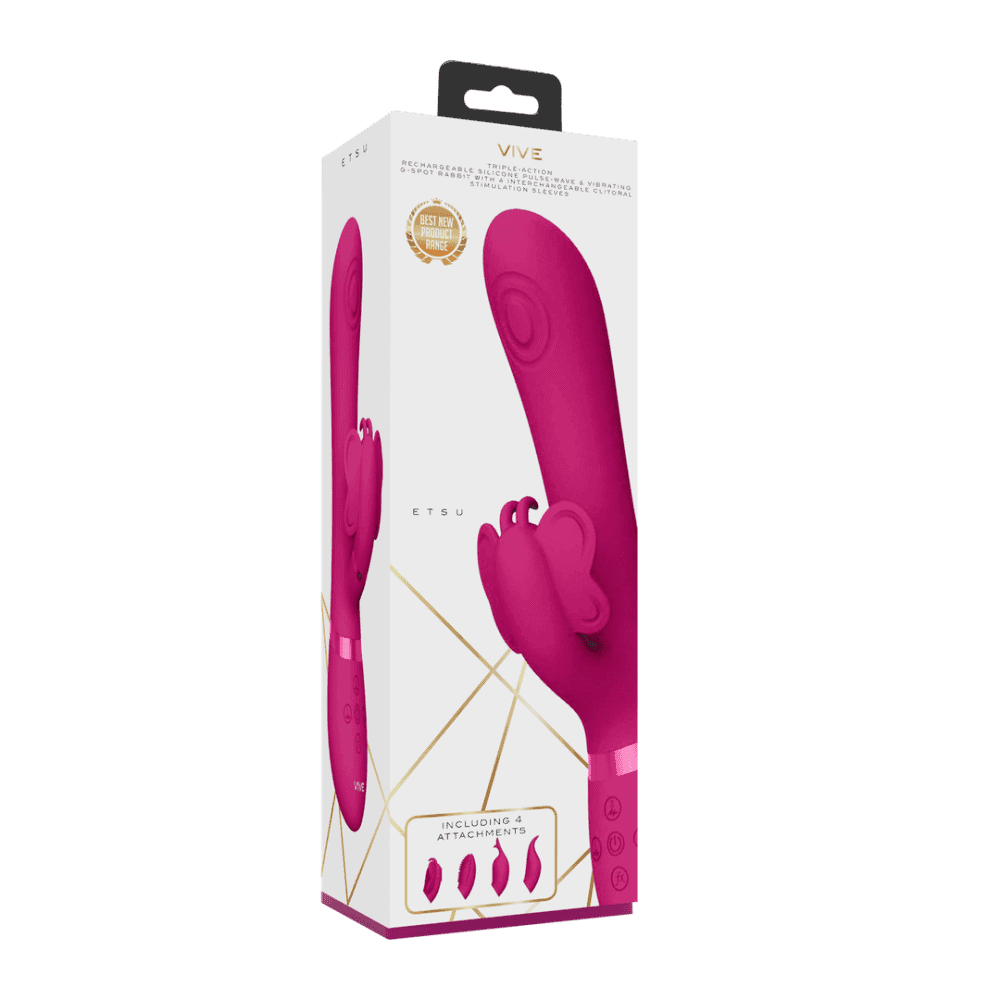 ETSU is een van de krachtigste en meest veelzijdige vibrators op de markt. Het beschikt over 4 verschillende, verwisselbare, siliconen clitorisstimulatie hulzen voor een rijke clitoris stimulatie. Dankzij de drie innovatieve F1-motoren van de nieuwe generatie met 10 functies en geavanceerde technologieën (alle drie de motoren kunnen onafhankelijk worden bestuurd) is dit speeltje echt top of the bill! De vibratortip bevat een NG F1 pulsgolfmotor met 10 functies voor G-Spot-stimulatie en bevat tegelijkertijd een unieke NG F1-vibratiemotor met 10 functies voor clitoris stimulatie. Dit betekent dat dit speeltje tot 100 verschillende functies biedt, en inclusief de 4 verschillende clitorishulzen, zijn je opties grenzeloos. Het speeltje is gemaakt van 100% zijdezachte siliconen van medische kwaliteit (hypoallergeen), volledig waterdicht (IPX7) en extreem stil met minder dan 60 dB. Dit betekent dat je hem overal kunt gebruiken waar je hartje begeert! De lithium-ionbatterij van het speeltje word opgeladen middels de magnetische USB aansluiting. Wanneer hij volledig is opgeladen, biedt hij 40 minuten aan gepassioneerde speeltijd. Zo simpel: aansluiten, opladen en heerlijk spelen! Wanneer je bijna een climax nadert, kun je met één druk op de speciale functie climax-knop alle motoren onmiddellijk op volle kracht / snelheid zetten en, nog belangrijker, je naar een wereldschokkend orgasme brengen. Alle VIVE-vibrators worden geleverd met een volledige garantie van 1 jaar.