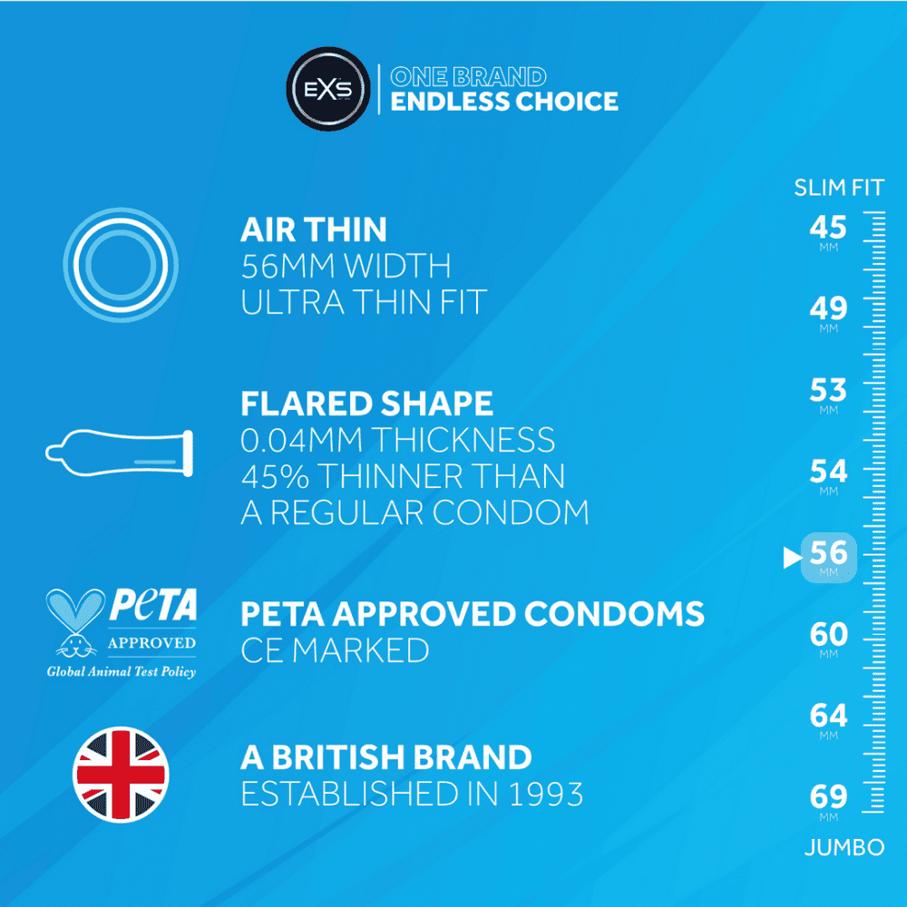 EXS Air Thin are amongst the thinnest quality latex condoms in the world, they have a comfy 56mm fit, have no latex smell and feel like you are wearing no condom for a truly intimate experience. With the latest air thin technology, our condoms are proven to enhance sensation without compromising safety. Vigorously tested to the European standards and by the British Standards Institute (BSI). This product is extremely thin yet has the strength of thicker regular latex condoms.