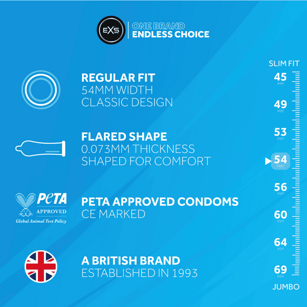 EXS Regular is de originele en meest verkochte van alle EXS condooms. EXS Regular condooms zijn een 54 mm breed condoom met een uitlopende speen en zijn geschikt voor de meeste mannen om met vertrouwen te gebruiken. EXS Regular condooms hebben geen latexgeur en zijn gemaakt van een dunne maar sterke zijdeachtige latex. Krachtig getest volgens de Europese normen en door het British Standards Institute (BSI) Dit product is extreem dun maar heeft de sterkte van dikkere reguliere latexcondooms.