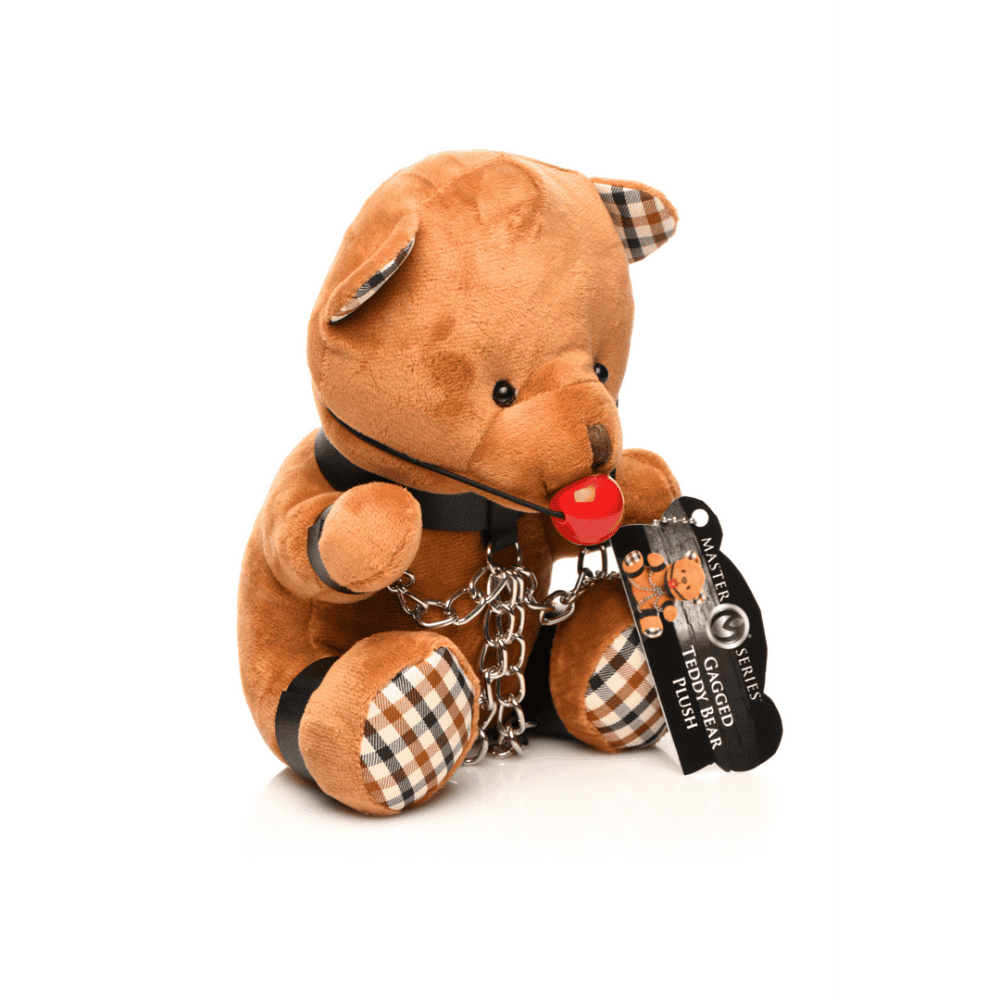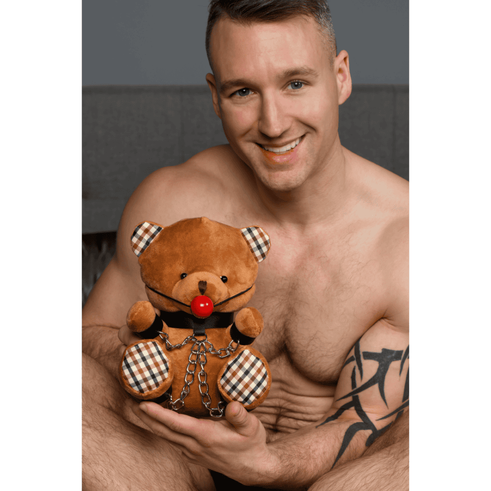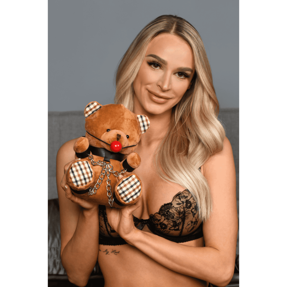 Geef deze gegeselde beer als een gagschenk of houd hem voor jezelf! Hij is net groot genoeg om mee te knuffelen, maar neemt niet te veel ruimte in! Voeg hem toe aan je collectie voor Littles om mee te spelen, geef hem aan je submissive tijdens de nazorg, of houd hem bij je kussens! Met een halsband, pols- en enkelboeien en nikkelvrije kettingen die ze verbinden, is deze kleine beer beperkt voor jouw plezier en vermaak! Gemaakt van polyester, PU nepleer, plastic en nikkelvrij metaal. Afmetingen: Totaal: 21,8 cm Lengte x 17,3 cm Breedte x 14 cm Diepte Materialen: Polyester, PU leer, ABS plastic, metaal Kleur: Verbrand Oranje Opmerking: Buiten het bereik van kinderen houden. Belangrijkste Kenmerken: Geweldig Gagschenk!: Deze gegeselde teddybeer is een geweldig gagschenk voor iemand speciaal! Hij heeft enkel- en polsboeien, kettingen die zijn kleine armen binden, en een balgag in zijn harige mondje! Knuffelbare Speelgoed: Het perfect formaat knuffeldier om mee te knuffelen. Geweldig voor nazorg! Nikkelvrij Metaal: Al het gebruikte metaal is nikkelvrij en veilig voor het lichaam.
