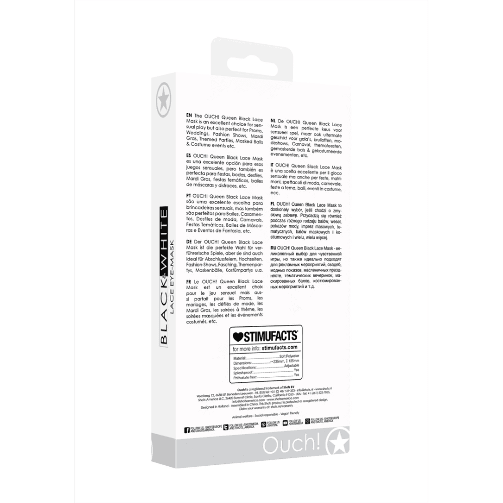 OUCH! presenteert een serie van 4 handgemaakte, hoogwaardige, lichtgewicht en makkelijk draagbare maskers met moderne details, geïnspireerd door Venetië. Vervaardigd met lasersnijtechnologie uit het fijnste, milieuvriendelijke materiaal. Deze maskers voorzien u echt van een vleugje verleidelijke geheimzinnigheid. Twee kwaliteitslinten houden het masker op zijn plaats voor lange uren comfortabel draag- en speelgenot en zorgen ervoor dat het masker makkelijk op maat kan worden gemaakt. De OUCH! Queen Black Lace Mask is een perfecte keus voor sensueel spel, maar ook uitermate geschikt voor gala’s, bruiloften, modeshows, Carnaval, themafeesten, gemaskerde bals gekostumeerde evenementen, etc.