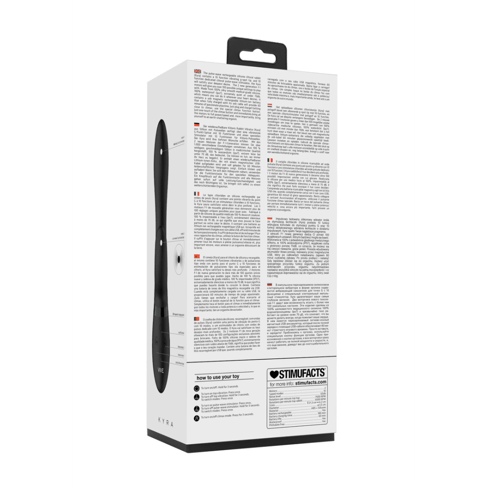 De KYRA is een ultra-sterke ?rabbit?-vibrator en heeft een vibrerende G-spot ?tip? met 10 functies plus een speciale clitorale pulsgolf-stimulator met 10 functies, die gegarandeerd aan je diepste verlangens zal voldoen. De 2 motoren geven je meer dan 100 mogelijke unieke instellingen om mee te spelen. De KYRA is gemaakt van 100% zijdezachte medische siliconen, is 100% waterdicht (ipx7) en extreem stil bij minder dan 70 dB, wat betekent dat je hem (bijna) overal kunt gebruiken. Hij bevat een oplaadbare lithium-ionbatterij die, wanneer volledig opgeladen, 60 minuten gepassioneerde speeltijd zal bieden. Klik de bijgesloten USB kabel op het magnetische aansluitpunt en hij laadt op!Wanneer je een climax nadert, zal één druk op de speciale functie climax-knop alle motoren onmiddellijk op volle kracht / snelheid brengen en, nog belangrijker, je naar een wereldschokkend orgasme voeren.
