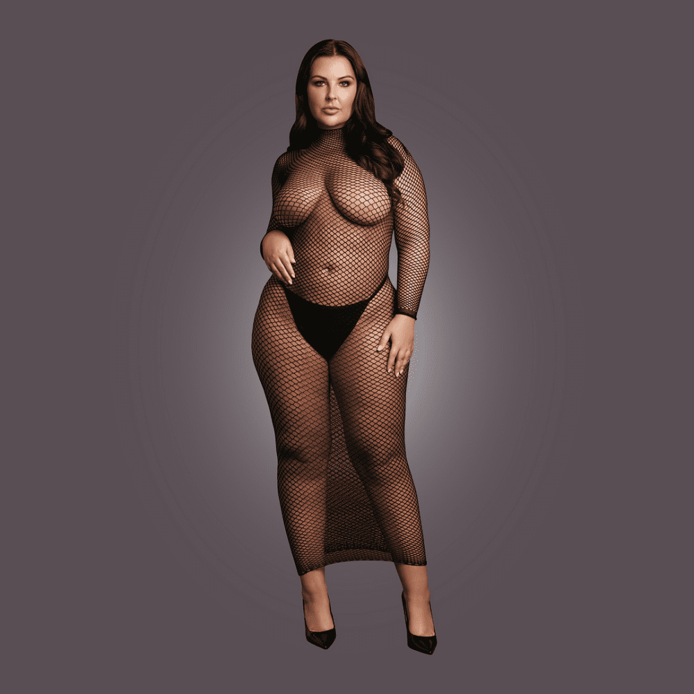 Elegante jurk met lange mouwen, col en visnetpatroon. Kan op de gewenste lengte gedragen worden. De zachte en super rekbare stof past in de maten XL&nbsp tot 4XL.