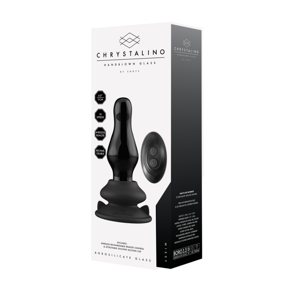 Of je het nu alleen gebruikt of met de meegeleverde verwijderbare siliconen zuignap, je slaapkamerspel zal nieuwe hoogten bereiken met de Chrystalino-glasvibrators van Shots.Deze krachtige Chystalino vibrator van glas met 10 snelheden is gemaakt van hoogwaardig niet-poreus zwart borosilicaatglas dat lichaamsveilig, onbreekbaar en duurzaam is.Ze zijn perfect voor temperatuurspelletjes, je kunt het opwarmen in warm water of afkoelen in de koelkast voor extra stimulatie.De sterke siliconen cupbasis van medische kwaliteit kan op bijna elk vlak oppervlak worden aangebracht voor een sterke, veilige grip en kan ook worden gebruikt met uw favoriete O-Ring Strapon.Met de meegeleverde draadloze afstandsbediening heb je de bediening binnen handbereik – of nog beter, in de handen van je partner! Switch door 10 unieke vibratiepatronen voor echt intense, adembenemende orgasmes!Houd de aan/uit-knop op de vibrator of draadloze afstandsbediening 3 seconden ingedrukt om in te schakelen. Druk op de aan/uit-knop om door de 7 niveaus en 3 trillingssnelheden te switchen. Om uit te schakelen, houdt u de aan/uit-knop 3 seconden ingedrukt.Let op: voorzichtig gebruiken. Glazen pluggen kunnen erg glad zijn als ze nat zijn of glijmiddel op zich hebben. Als het op een stenen of betegelde vloer valt, kan het glas afbrokkelen of breken. Inspecteer de plug altijd goed voor gebruik en stop het gebruik onmiddellijk als deze beschadigd is.