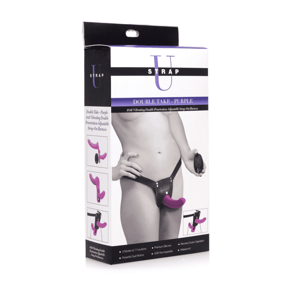 Haal er net zoveel uit als je erin stopt! Deze dubbele dildo en harnas set trakteert jullie allebei op op afstand bestuurbare vibraties. Ontdek 3 snelheden van dreunen en 7 kloppende patronen van de dubbele motoren – een voor jou en een voor je partner. Plaats de langere dildo door het gat van het minimalistische harnas, zodat de drager het kleinere deel kan inbrengen, dat gebogen is om naar de G-spot te reiken. Een verhoogde knobbel aan de buitenkant is ontworpen om clitorale stimulatie te bieden. De langere dildo is ook gebogen en heeft een bolle kop om de P-spot of G-spot van de ontvanger te masseren. De afstandsbediening maakt het gemakkelijk om door de 10 instellingen te bladeren zonder de penetratie te pauzeren. Het verleidelijke harnas met 2 verstelpunten voor een perfecte pasvorm. De dubbelzijdige dildo is gemaakt van eersteklas siliconen, waardoor hij niet poreus en ftalaatvrij is, maar niet compatibel met siliconen smeermiddelen. Deze pleasure tool is oplaadbaar en waterdicht. Reinig met milde zeep of speelgoedcl eter. Afmetingen: 10,75 inch in totale lengte. Lange dildo is 5,5 inch inbrengbare lengte, 1,2 inch op de smalste diameter, 1,7 inch op het breedste punt. Kleine dildo is 3,5 inch lang, 1,35 inch bij de breedste diameter, 1 inch bij de smalste. Harnas past tailles tot 41 Inclusief dubbele dildo, afstandsbediening en harnas. Opladen via USB. Afstandsbediening vereist 1 27A batterij