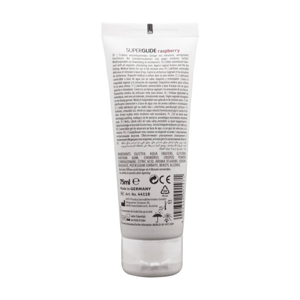 HOT SUPERGLIDE EDIBLE 100 % eetbare glijgel! Eetbare, glijgel op waterbasis, verkrijgbaar in 5 voortreffelijke smaken. De ingrediënten worden ook gebruikt in voedsel en zijn daarom geschikt voor consumptie. De frisse en fruitige smaak op de lippen en tong maakt orale seks nog aangenamer en interessanter voor beide partners.
