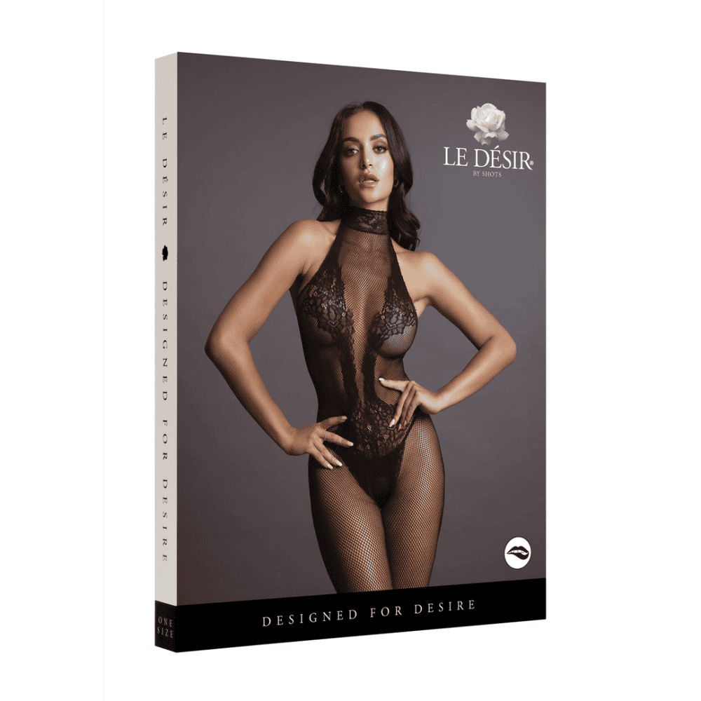 Bodystocking met combinatie van kantpatroon en visnet, halternek en open kruis. De zachte, superelastische stof is geschikt voor maten S tot XL.